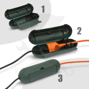 Használata egyszerű: A kültéri lengő hosszabbítók végét kétoldalt vezessük be, csatlakoztassuk egymáshoz, majd hajtsuk rá a vízzáró tetejét, hogy az megfelelően záródjon.