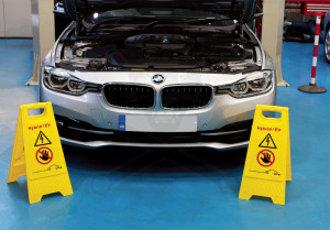 Kétoldalas figyelmeztető álló tábla Hybrid / Elektromos Gépjárművek nagyfeszültség elleni érintését tiltó jelzésekkel.