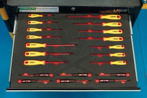 - 3. fiók: 20 db-os szigetelt csavarhúzó készlet (3 féle lapos + 3 féle PH kereszt + 7 féle torx + 6 féle műszerész lapos és PH kereszt)