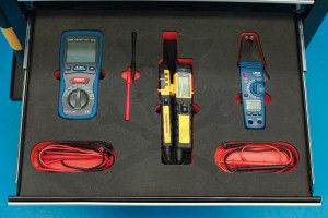 - 6. fiók: 3+3 db-os Autóipari hibrid/elektromos mérőműszer készlet: Feszültségvizsgáló 1000V CATIV + Szigetelésvizsgáló 1000V CATIII + Lakatfogó 80A CATIII + különféle mérőszonda készlet CATIII