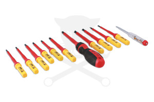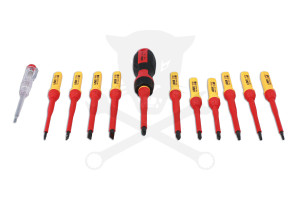 Különlegesen kialakított 1000V-os VDE védelmű Csillag-Lapos-Torx csavarhúzó készlet a nagy feszültségű vezetékek és kábelek szerelésére tervezve.