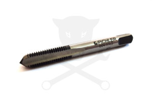 Ezzel az egyenes kialakítású colos UNF 1/4-28"-os méretű kézi menetfúróval vágjuk bele a menetet a beletört izzítógyertya testébe