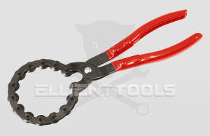 Kipufogó csövek vágására kialakított vágó-görgős lánccal szerelt speciális fogó.