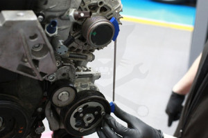 Ékszíjtárcsa beállító szerszám hosszbordás szíjjal szerelt motorokhoz.
