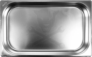 Rozsdamentes acél edény lekerekített sarkokkal és sima peremekkel, amelyek megkönnyítik a tisztítást.