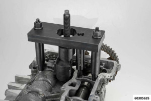 A kiszereléshez viszont le kell szerelni a motor legtetején található kartergáz fedelet, a kihúzó híd lábainak a szakszerű feltámasztási helyeinek az eléréséhez.
