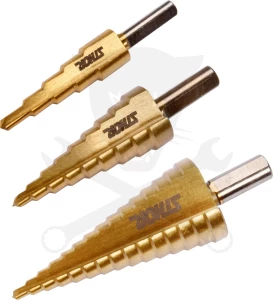 - 3 részes lépcsős lemezfúró készlet, mely alkalmas rozsdamentes acélok, szerkezeti és hidegen hengerelt acélok, szinesfémek, lemezek, műanyagok megmunkálásához.