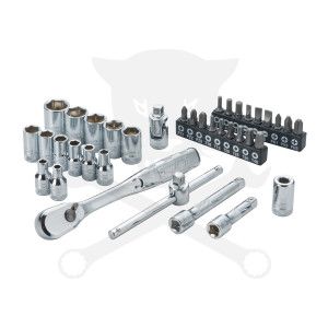- Tartozékok: 1/4"-os körtefejű racsni, 1/4"-os meghajtás 2”-os toldat, 1/4"-os hajtású 3”-os toldó, 1/4"-os meghajtás csúszó T-markolat, 1/4"-os hajtású gyertyakulcs, 1/4"-os hajtású univerzális csatlakozó, Bittartó