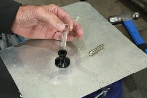 A becélzás után kivesszük a nagyítót a csúszásgátló O-gyűrűvel felszerelt tartóból és a helyére behelyezzük a SUJ2 ötvözött acél pontozót és egy kalapács segítségével megpontozzuk a felületet.