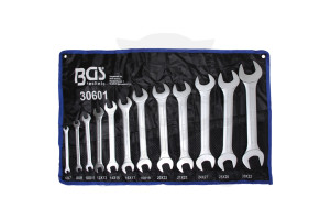 Minőségi villás-villáskulcs készlet többféle méretben szövet falitartóban.