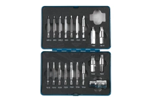 Belső kulcsnyílású sérült Torx és Imbusz csavarok eltávolítására készített speciális csavar kiszedő készlet 19 darabos kiszerelésben.