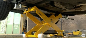 Egyszeres mini ollós emelő levegős hidraulikus pumpával, mechanikus biztonsági zárral.