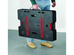- Összecsukott állapotban a munkapad egy praktikus, rendkívül keskeny formát ölt, amit a fogantyúk segítségével könnyedén el lehet vinni bárhova, ahol szükség van a használatára.