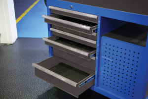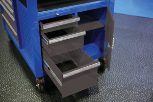 Különleges, sok férőhelyes szerszámos kocsi, melyben 10 fiókot helyeztek el fakkokkal és egy kinyithatós ajtóval