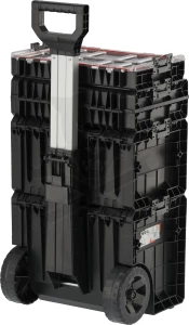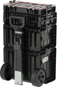 Az egész egy 4 részes, teleszkópos fogantyúval ellátott, kerekeken guruló mobil készlet, amely nagy, gumiborítású kerekekkel rendelkezik, amelyek egy fémtengelyre vannak szerelve. Ezenkívül a szállított szerszámok biztonságáról erős poliamidból készült masszív rögzítők és oldalsó csatlakozók is gondoskodnak. A fedelekbe beépített rugalmas tömítések biztosítják a fröccsenő víz elleni védelmet, ami megvédi a tartalmat a fröccsenő víztől és a portól.
