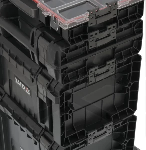 A készlet tetején egy tágas rendező található, alatta egy szerszámdoboz, amely két oldalon védőhabbal van ellátva. Alatta egy másik elem egy nagyméretű doboz, legalul pedig egy kerekeken guruló rendszerdoboz található.