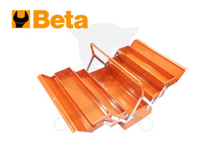 Hordozható szerszámosláda, 5 tároló rekesszel, kétszárnyas szétnyíló tetővel.