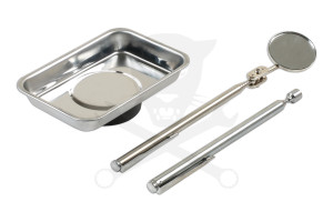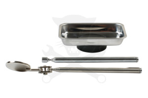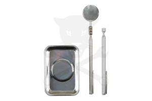 Műszerész méretű, 3 db-os praktikus összeállítású mini mágneses tálka + teleszkópos csavarfelszedő mágnes + vizsgáló-ellenörző teleszkópos tükör klt.