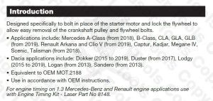 - Az 1,3 literes Mercedes-Benz és Renault motorok vezérlés pozíciónálásához használja a LAS-8148-as cikkszámú Laser Tools célszerszám készletet.